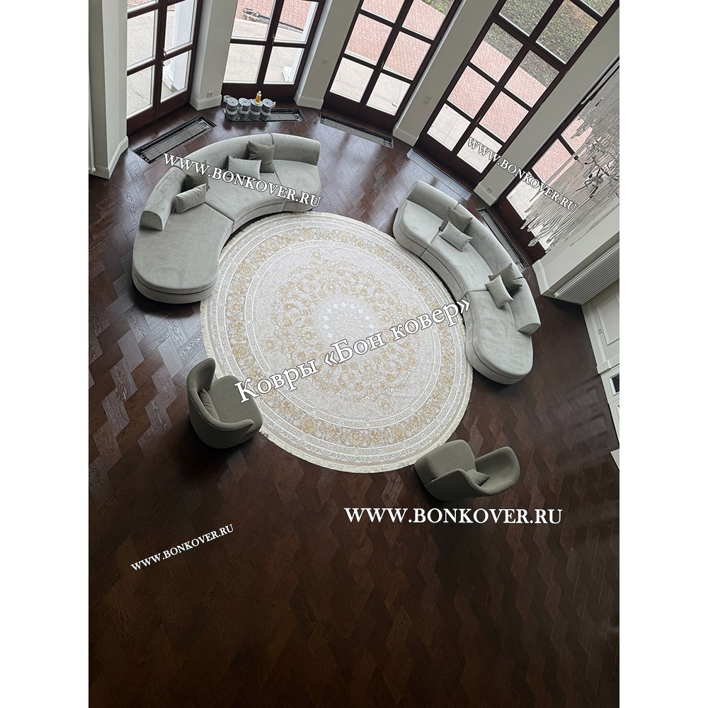 Импозантный Круглый Ковер Для Гостиной Арт 30256 наполняет интерьер комнаты теплом и уютом, гармонично сочетает в себе изящество и красоту. Он изготовлен из высококачественного сырья, комфортный и долговечный.